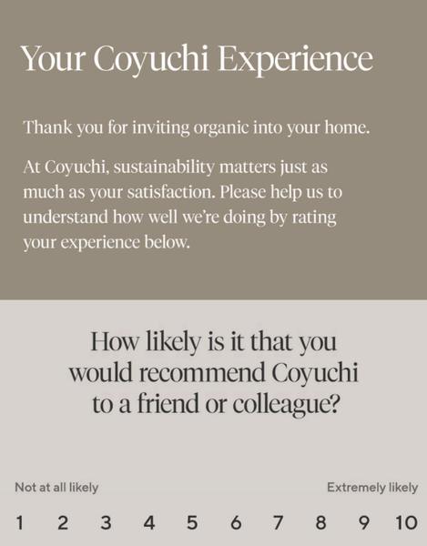 Coyuchi • 14th April 2023 Coyuchi Flows - Post-Purchase Series We'd love to hear from you... How are we doing?